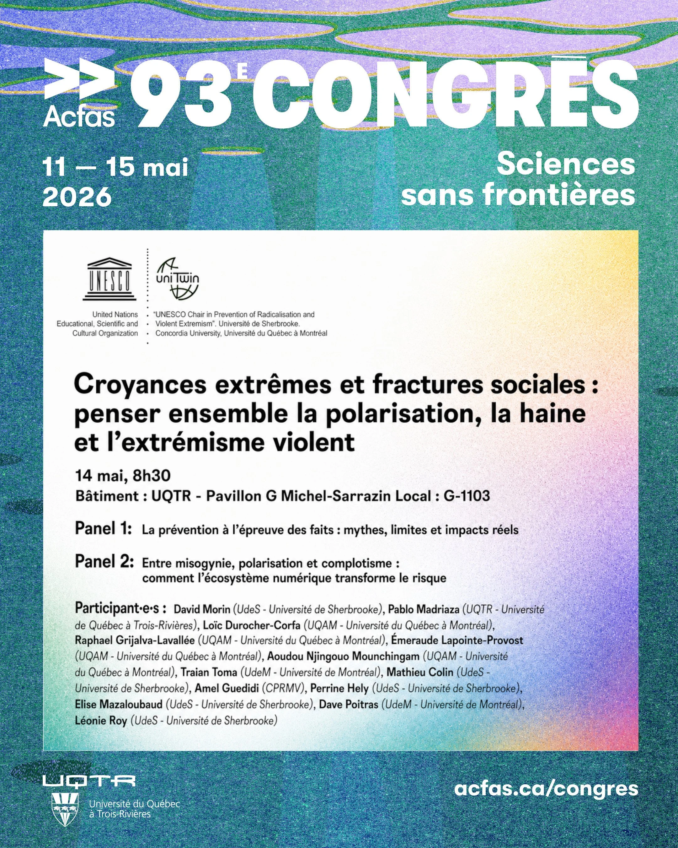 Ce colloque s’intéresse à la montée de la polarisation sociale, des discours de haine et de l’extrémisme violent dans les sociétés occidentales, notamment au Canada et au Québec. Il vise à montrer comment ces phénomènes, souvent étudiés séparément, sont en réalité étroitement liés et contribuent à la fragmentation du lien social.